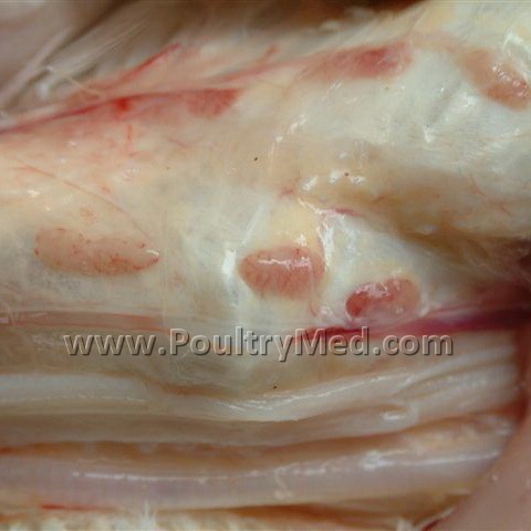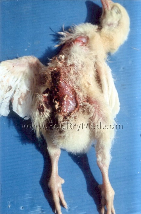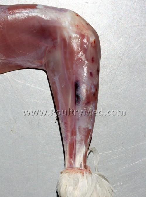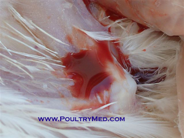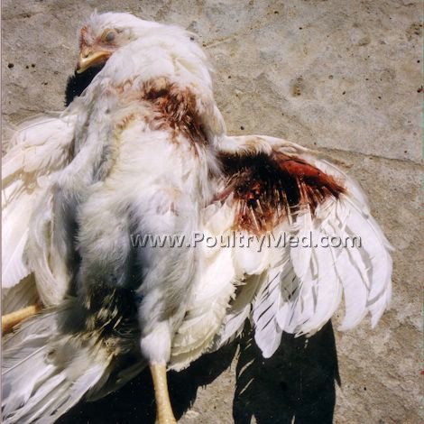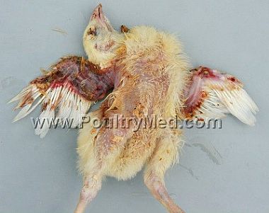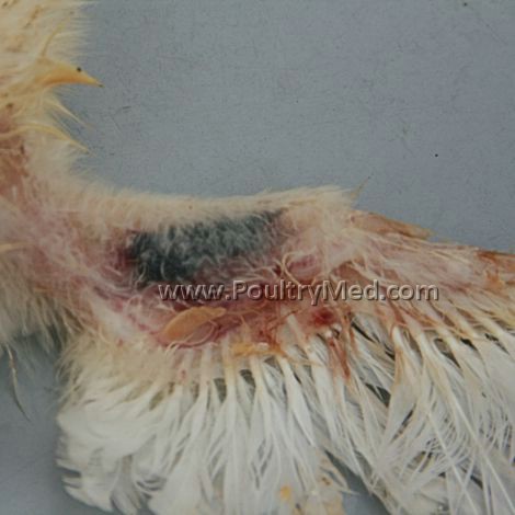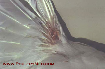 Blue wing disease" of chickens (egg-type pullets). Focal skin lesion on the wing.