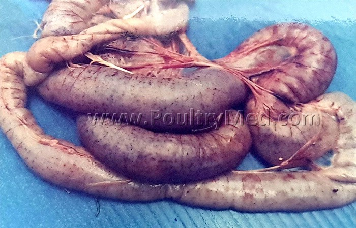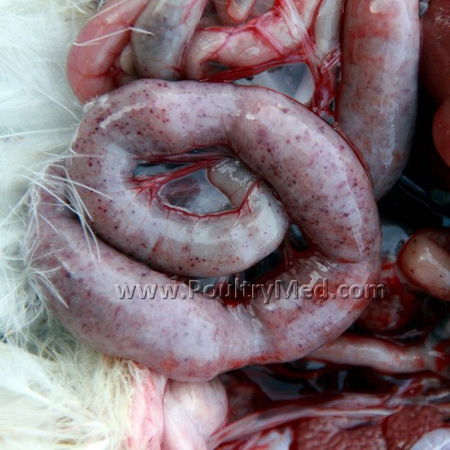 Eimeria necatrix: is highly pathogenic species. Red petechiae visible on serosa.