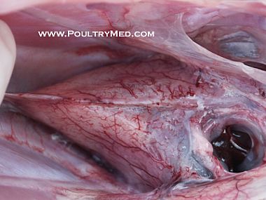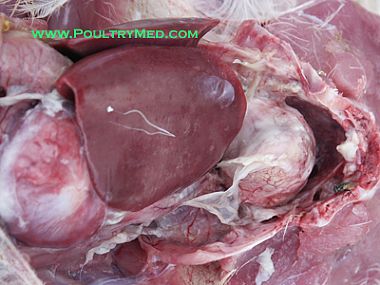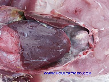 Subacute pericarditis and perihepatitis in 4 weeks old turkeys due to E. coli infection.