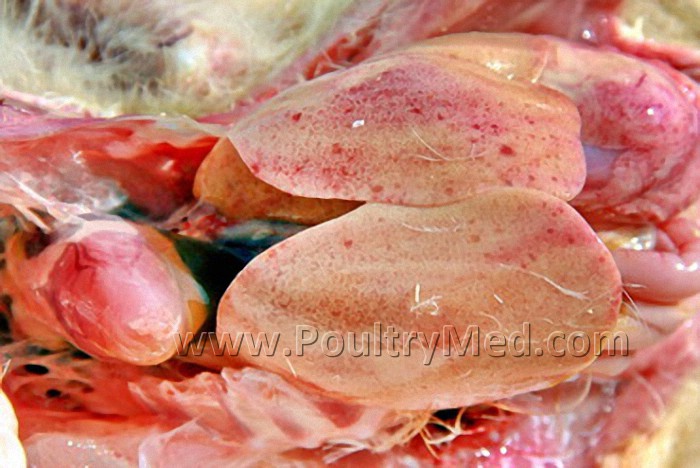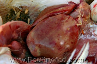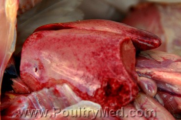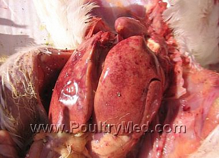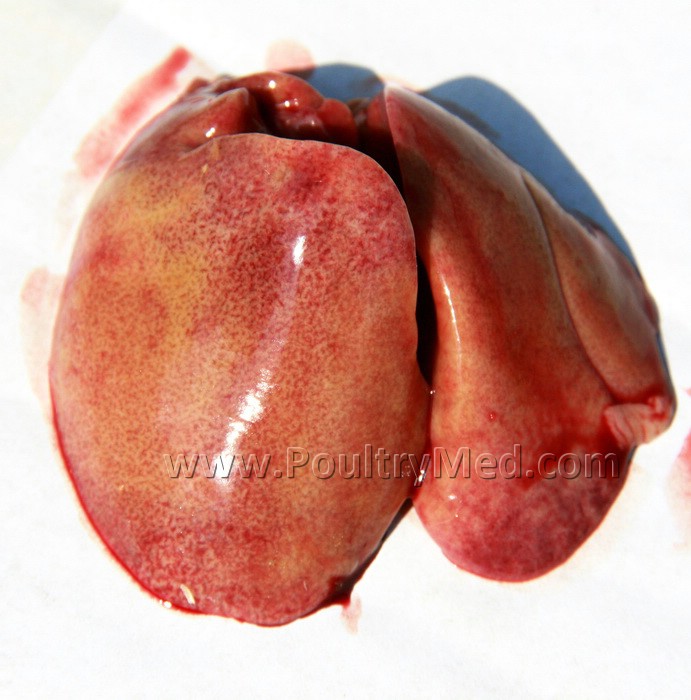 Enlarged pale liver. Spotted hemorrhages in the liver.