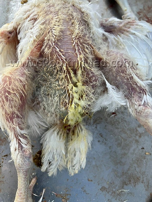 Yellowish diarrhea soiling the feather of the cloaca. Image by Dr. Katriel Elrom.