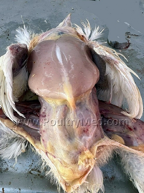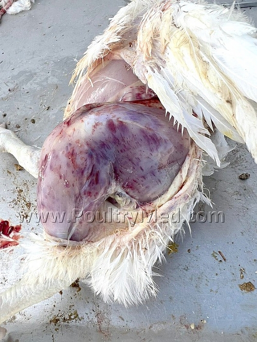 15-day-old broiler flock. Sudden death with full crops without clinical signs.