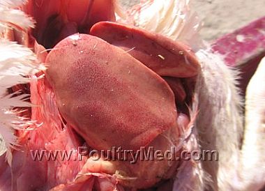 Liver: enlarged, pale yellow with multiple petechial haemorrhages