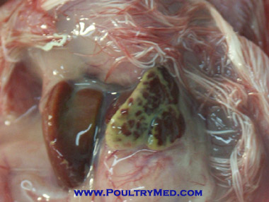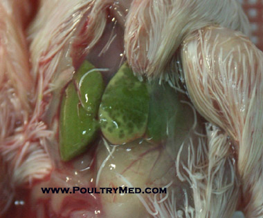 IBD - virus injection of 11-day -old embryonated eggs (SPF). Injection route: CAM. 7 days Post Injection: Typical pale liver bile stained with wide necrotic foci.