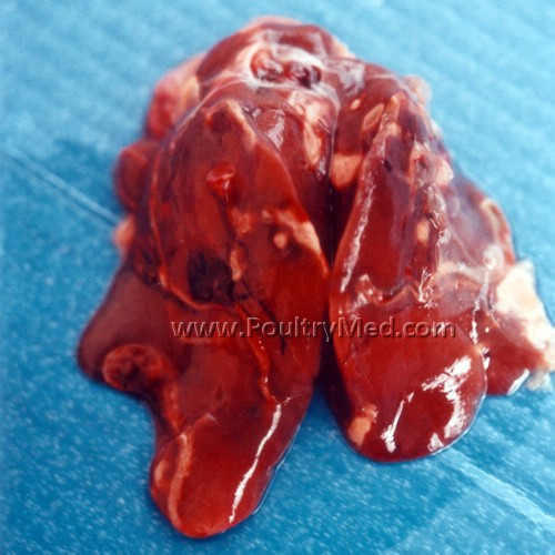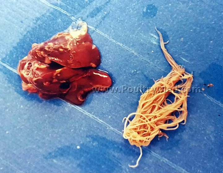 Ascaridiasis in Peafowl. Lesions are observed also in the liver.