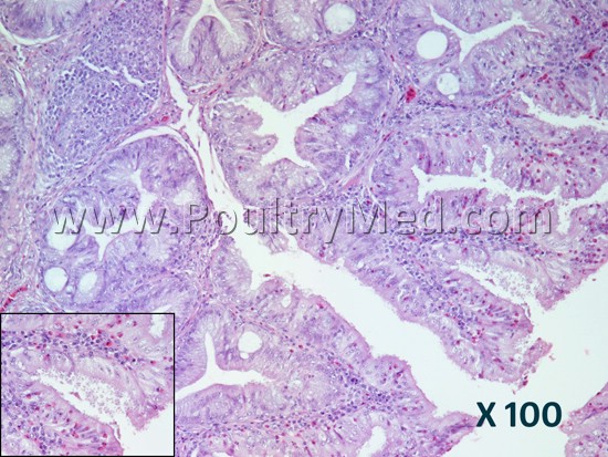 Description: Bursa of Fabricius (BF). The bursa’s follicles are demonstrated with severe to complete lymphocytic depletion, severe intrafollicular hyperplasia, and multifocal cellular necrosis and cyst formation. The interfollicular stroma is mildly expanded with lymphoplasmacytic infiltration and fibroblast hyperplasia. There is mild to moderate, multifocal, heterophilic infiltration in the interfollicular stroma and within the epithelium. The interfollicular epithelium is severely hyperplastic with numerous globular protozoal organisms (consistent with Cryptosporidium spp.) attached to the luminal epithelium surface and in the adjacent bursal lumen (lower box).