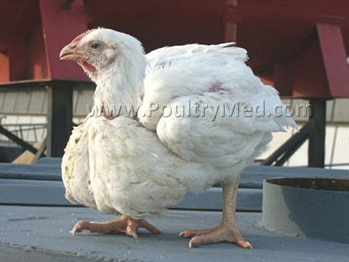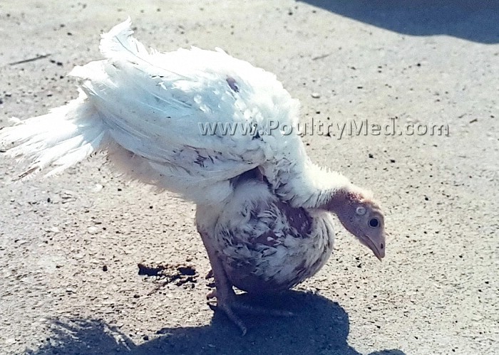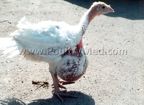 A 7 - wk - old turkey with a pendulous crop. The crop is filled with feed, particles of bedding and fluid that is often foul smelling.