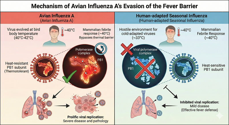 A pivotal study published in Science elucidates a critical mechanism governing the severity of zoonotic influenza infections. Researchers have demonstrated that the core body temperature differential between birds and mammals acts as a primary barrier to viral replication, which is effectively reinforced by the mammalian febrile response. However, avian influenza A viruses (IAVs), having evolved to replicate within the higher physiological temperatures of avian hosts (400C to 420C), possess a thermal resilience that allows them to bypass this innate immune defense. This thermotolerance is driven largely by the viral polymerase subunit PB1, a finding that offers new insights into the pathogenicity of historical pandemics and current zoonotic threats.