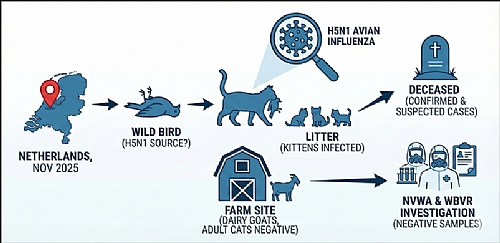 Wageningen Bioveterinary Research (WBVR) has confirmed the first recorded case of highly pathogenic avian influenza (HPAI) in a domestic cat within the Netherlands. On November 19, a kitten found deceased at a farm housing dairy goats tested positive for the H5N1 virus strain.