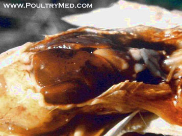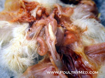Intestinal lesions of pullorum disease are rare in chickens but are quite common in turkey poults.Accumulation of cecal cores in the ceca.