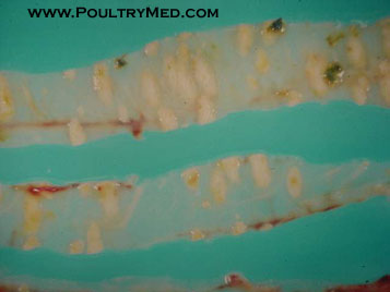 Large abscesses in the lungs of a 12 days old affected chick. This is one of the most common characteristics of pullorum disease in chickens. Labored breathing can be observed in affected flocks due to the extensive lesions in the lungs.