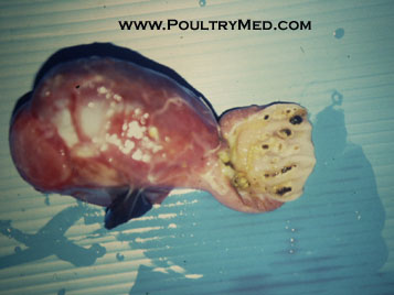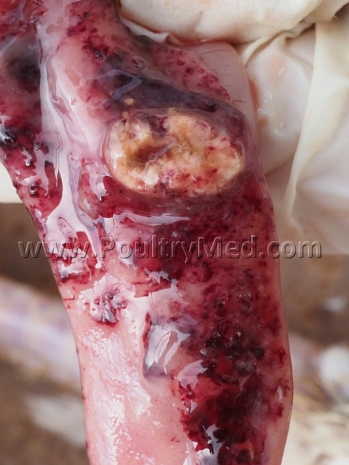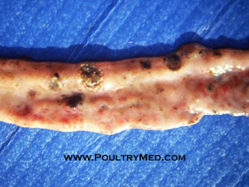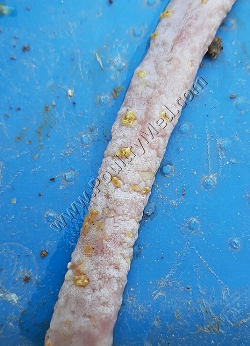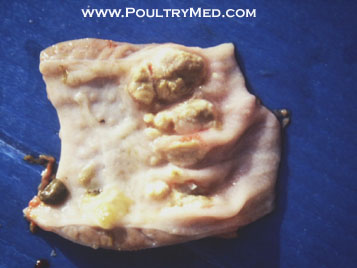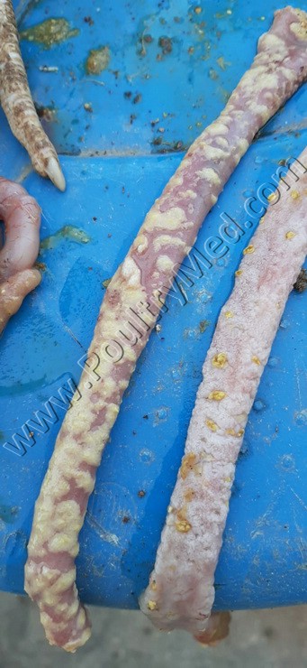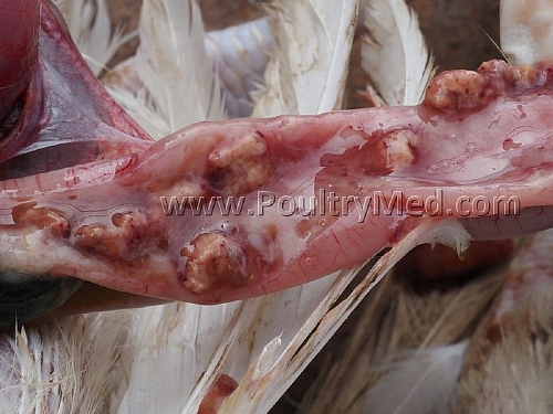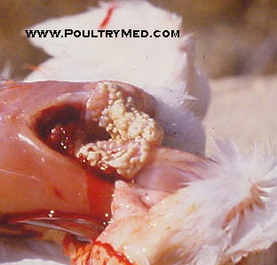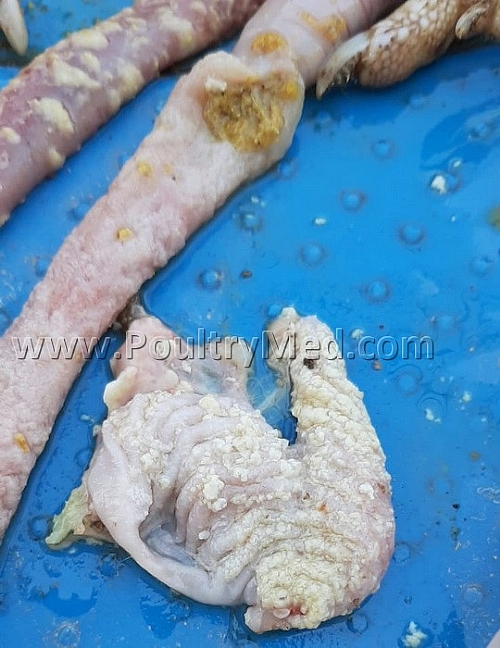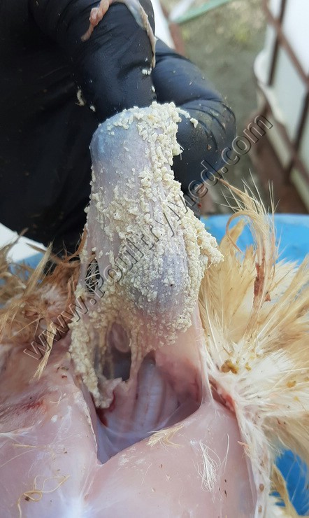 5 weeks old turkey. Candidiosis of the crop. Caseous thickening of the mucosa of the crop. Image by Dr. Gilad Ayali