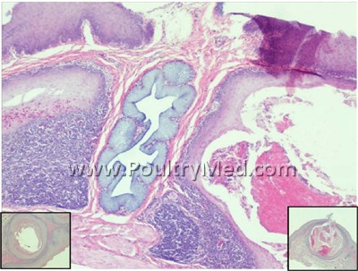 Description: The esophageal mucosa is demonstrated with 2 squamous metaplastic and 1 preserved mucous glands; normal glandular epithelium of affected glands is replaced by stratified squamous epithelial cells, squamous metaplasia. The inner surface of this thickened epithelium is keratinized (lower left box). Ducts of the mucous glands are affected by similar marked squamous metaplasia with narrowing of the glandular infundibula and obstruction of some ducts by accumulations of keratin and cell debris (lower right box). One gland is dilated and cystic, with the cysts lined by a thin layer of keratinizing squamous epithelium. Cysts are often filled with cell debris, keratin, and basophilic material. Affected glands are partially surrounded by accumulations of lymphocytes, plasma cells and some heterophils.