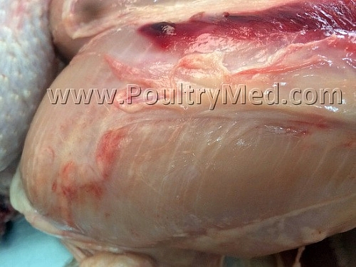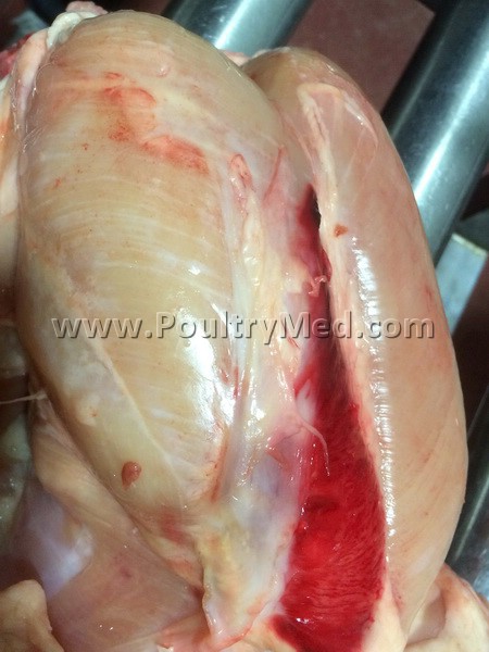 Hardening of the breast muscle in the proximal part. Surface hemorrhaging.