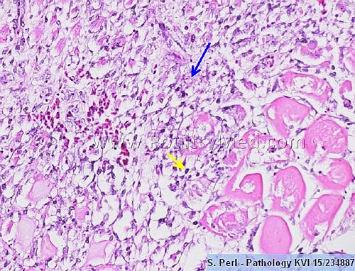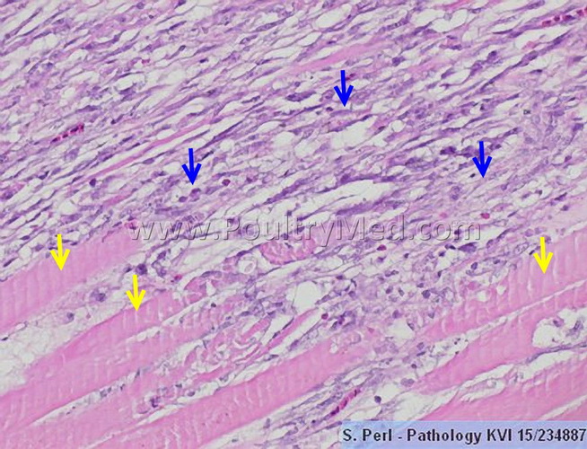 Degenerative necrotic changes. Macrophages between the necrotic muscle fibers (yellow arrow). Muscle fibres are replaced by fibrous tissue (blue arrow)