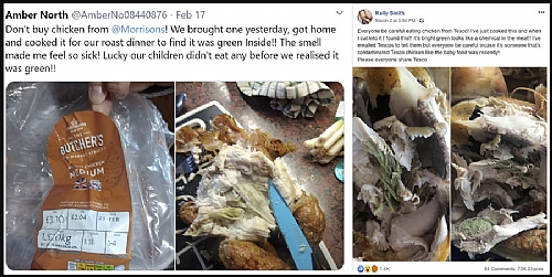 Various photos posted on social media show poultry meat tainted with a putrid, green stain in poultry meat bought from different supermarkets (Tesco, Sainsbury's, Asda and Morrisons). It is unclear whether the birds all come from the same supplier and supermarkets have now opened an investigation into the cause of this pathology.