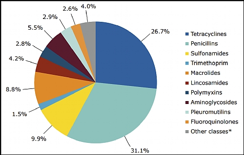 A total of 31 European countries - 30 EU/EEA countries and Switzerland - submitted antimicrobial veterinary medicinal products (VMPs) sales or prescription (two countries) data to the European Medicines Agency for 2019 and 2020. Of the overall sales of antimicrobials in the 31 countries in 2020, the largest amounts, as a proportion of total mg/PCU, were accounted for by penicillins (31.1%), tetracyclines (26.7%) and sulfonamides (9.9%). Overall, in 2020 these three classes accounted for 67.7% of total sales in the 31 countries.