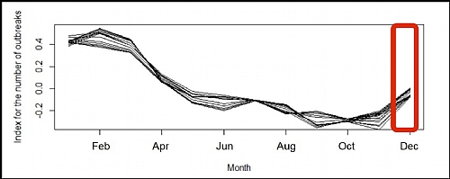 Using data reported to the OIE between 2005 and 2019 by 76 affected countries and territories for 18,620 outbreaks in poultry, researchers used a Seasonal and Trend decomposition using Loess (STL) analysis to determine the seasonal pattern of the disease. Based on the data reported to the OIE, spread is lowest in September, begins to rise in October, and peaks in February. The graph shown below shows the global seasonal pattern of HPAI in poultry and the red rectangle indicates where we currently are in the cicle.