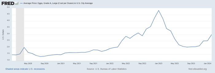 Nerdwallet cited the latest Consumer Price Index, which revealed a 5.8% increase in egg prices from January to February alone. Data from the U.S. Bureau of Labor Statistics (BLS) additionally indicates that the average cost of a dozen Grade A eggs rose from $2.52 in January to $3 in February.