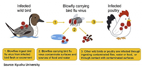 Unlike birds and mammals which the virus infects and replicates inside, blowflies instead ingest the virus from infected dead birds or their waste, with the virus maintaining infectivity for up to two days. Blowflies are capable of flying at least 2 kms per day, so the researchers estimate that is it feasible for them to reach nearby poultry farms or other wild bird populations within a 4 km range. The researchers believe that as the blowfly moves from place to place, it could contaminate surfaces, food sources and water sources, with healthy birds becoming infected through direct contact with these contaminated sources, or by ingesting adult or larval blowflies.